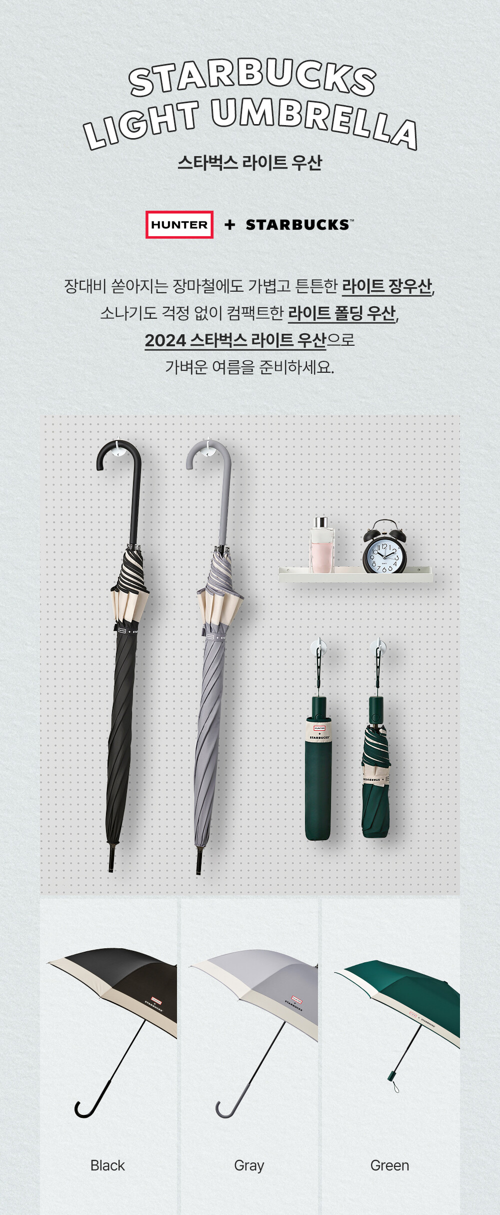 여름이면 꼭 필요한 필수아이템인 우산이 헌터와 협엽으로 가볍고 디자인도 깔끔하게 준비되었습니다. 스타벅스 아이스 아메리카노 톨 사이즈보다 가벼워 외출 시 부담 없이 가지고 다닐 수 있습니다. 커피 마시고 예쁜 우산도 함께 마련해 보시길 바랍니다.
